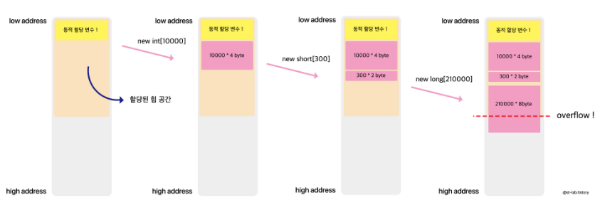 Java 같은 경우는 Gc(Garbage Collector)가 있어서 참조되지 않는 데이터들의 경우 알아서 메모리를 반납해줘서 Heap 메모리 관리에 수월. 하지만 C나 C++은 더이상 쓰지 않는 동적 할당 변수들을 해제해줘야한다. 만약 해제하지 않으면 흔히 말하는 메모리 누수(Memory Leak)가 발생한다. 또한 계속 쌓이다보면 할당된 Heap메모리 용량을 벗어나 에러가 발생하게 된다.