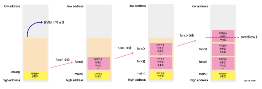 기저조건이 갖춰져 있지 않은 함수의 경우 무한히 호출되면서 Stack영역에 해당 함수의 지역변수, 매개변수 등의 데이터가 계속해서 쌓이게 되므로, Stack영역의 범위를 벗어나 Overflow가 발생하게 된다.