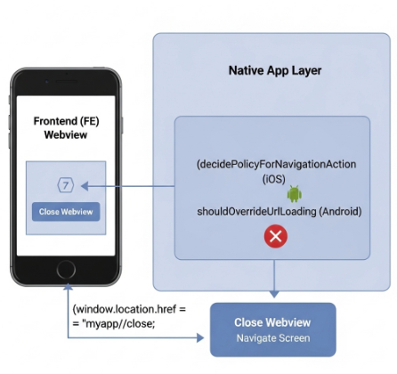 - 네이티브 : URL 로딩 이벤트 감시 → myapp:// 인지 확인 → 정의된 동작 실행 (웹뷰 닫기)