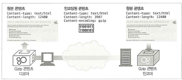HTTP 애플리케이션은 때때로 콘텐츠를 보내기 전에 인코딩을 하기도 함.