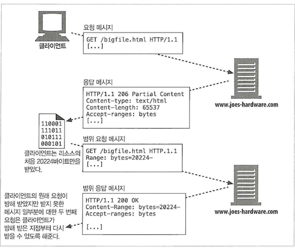 HTTP는 클라이언트가 문서의 일부만 요청할 수 있도록 특별한 범위 요청을 허용. 범위 요청을 이용하면, HTTP 클라이언트는 끊어진 다운로드를 중단된 시점에서 재개할 수 있음.