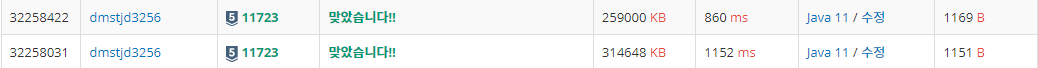 나는 위의 방식을 이용하여 데이터를 가공하였고, 정답을 도출해 냈을 때 1204ms의 속도가 나왔다.