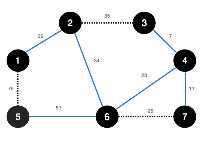 (3,4) 7 | (4,7) 13 | (4,6) 23 | (6,7) 25 | (1,2) 29 | (2,6) 34 | (2,3) 35 | (5,6) 53 | (1,5) 75