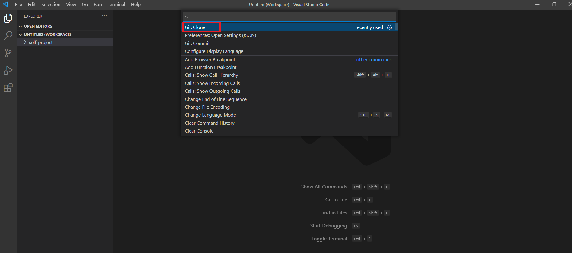 1. vscode에서 F1을 클릭하여 Git:Clone을 선택한다