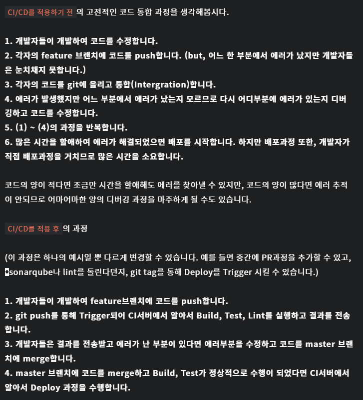 매번 개발자가 코드를 수정하고 빌드와 테스트를 하고 배포까지 한다면 상당히 많은 시간이 소요됩니다. 하지만 git에 코드를 올리는 것만으로도 누군가가 빌드와 테스트, 배포까지 해준다면,
