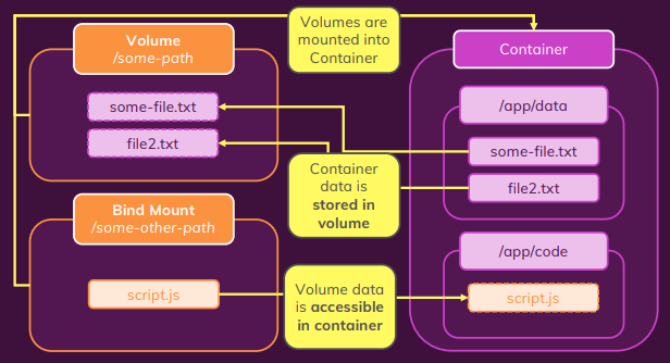 - 컨테이너는 read+write 데이터이다. 볼륨은 데이터 저장을 도울 수 있으며, 바인드 마운트는 컨테이너와의 즉각적인 인터렉션을 할 수 있도록 도운다.