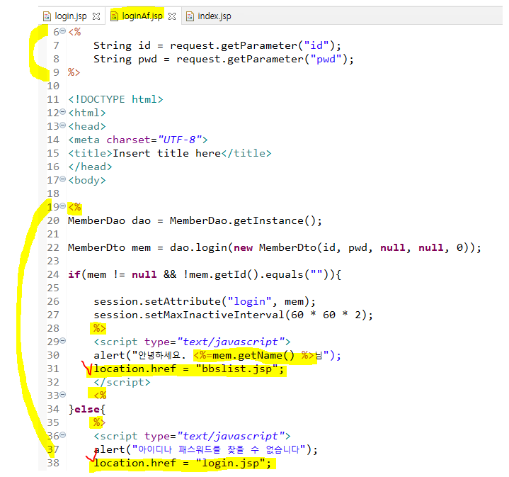 2. form에서 보낸 데이터 값을 <%%>(scriptlet)을 활용하여 받고 데이터를 처리한 뒤