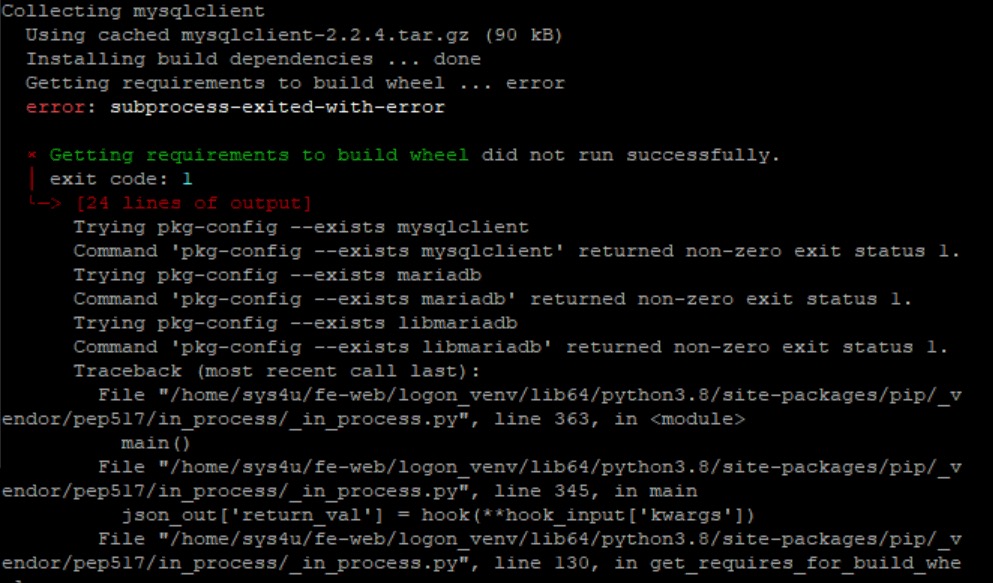 Django 등 다른 라이브러리들은 설치가 잘 되었으나 mysqlclient가 subprocess-excited-with-error 에러가 발생하면서 설치되지 않았다.