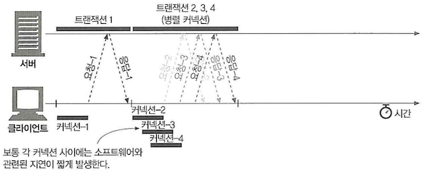 하나의 페이지를 로드하기 위해 여러 객체(HTML, 이미지 등)를 순차적으로 다운로드하면, 각 객체마다 커넥션 설정 지연이 누적되어 성능이 크게 저하.