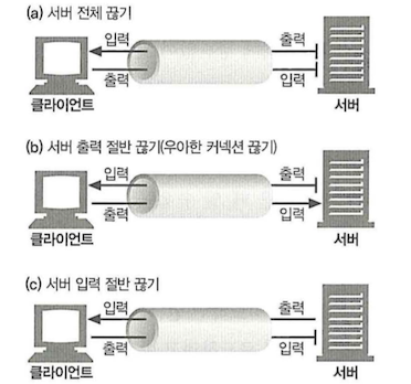 - 절반 닫기 : shutdown() 함수를 사용해 자신의 출력 채널만 닫고 상대방의 응답(입력 데이터)을 기다리는 방식.