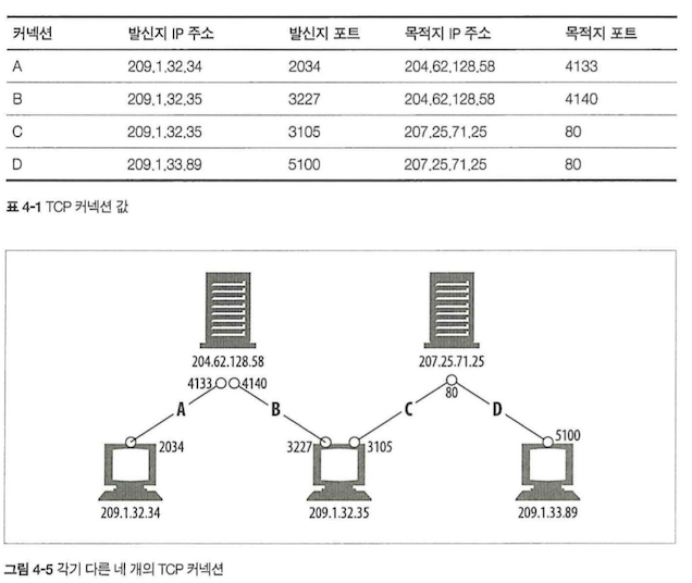 네트워크 통신이 이루어지는 통로인 TCP 커넥션은 다음 네 가지 요소의 조합으로 유일하게 식별됨.
