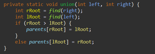 먼저 각 노드의 부모노드를 find()함수를 이용해서 찾아온 후, 두 노드 중 부모노드가 작은쪽의 부모노드로 합쳐주는 함수이다. 이렇게 되면 각 노드에 속한 집합 노드들도 자연스럽게 부모노드가 연결되므로 하나의 집합이 만들어 진다.