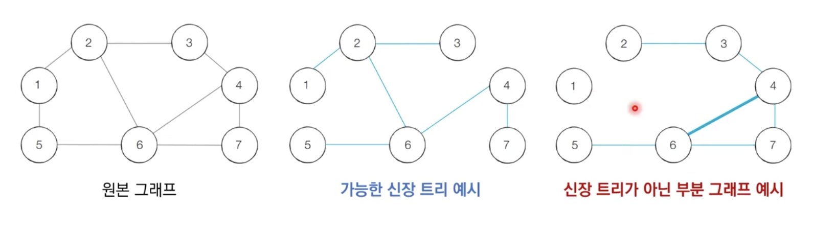 신장트리란 그래프에서 모든 노드를 포함하면서 사이클이 존재하지 않는 부분 그래프를 의미한다.